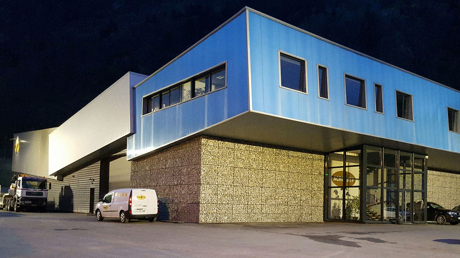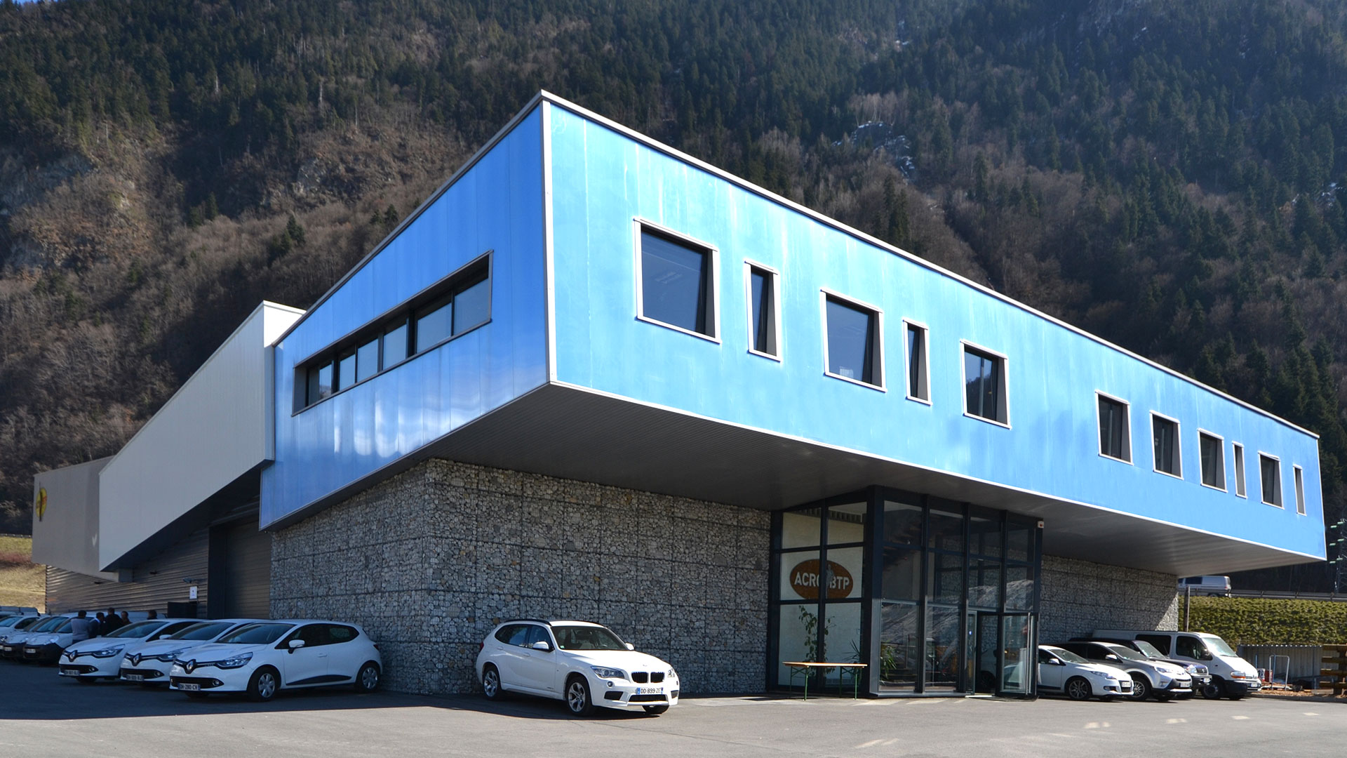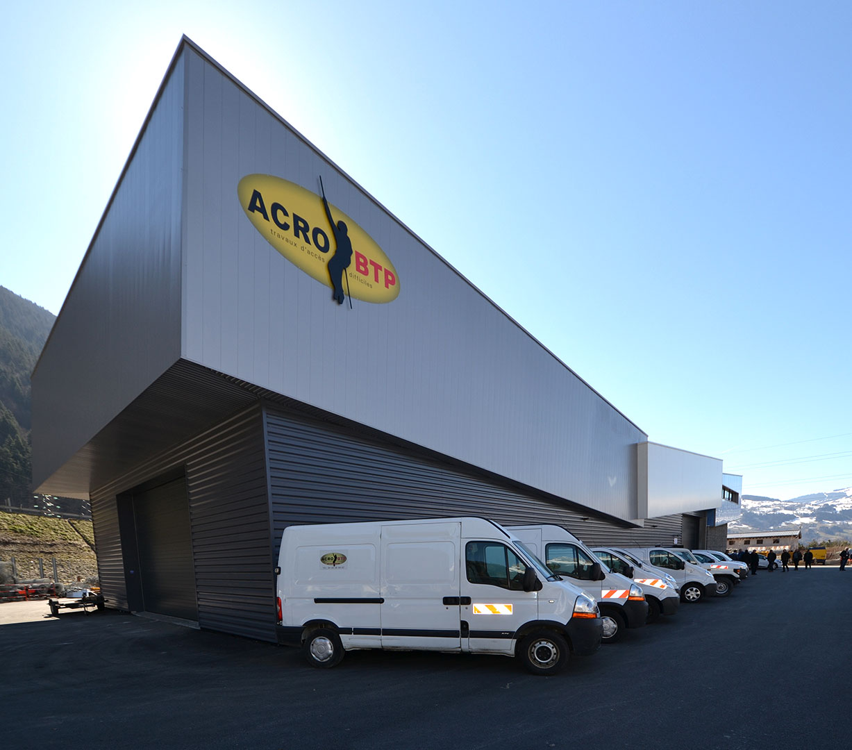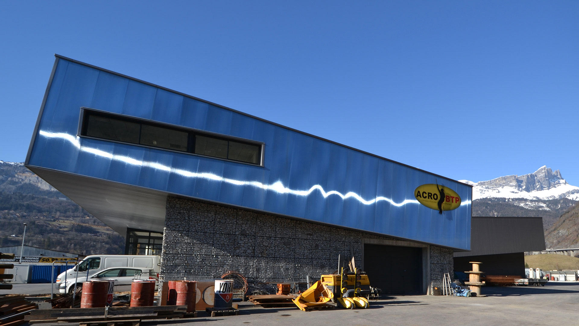 Composé d’un sous-bassement vêtu de pierre façon mur en gabions sur l’entrée et d'une peau métallique noire sur l’arrière, le bâtiment accueille les ateliers techniques et bureaux pour l’entreprise ACRO-BTP L’ensemble est coiffé de trois «boites» en matériau translucide. Le projet est à l’image de l’entreprise : une construction audacieuse où se mêlent l’acrobatie et la passion pour la montagne.