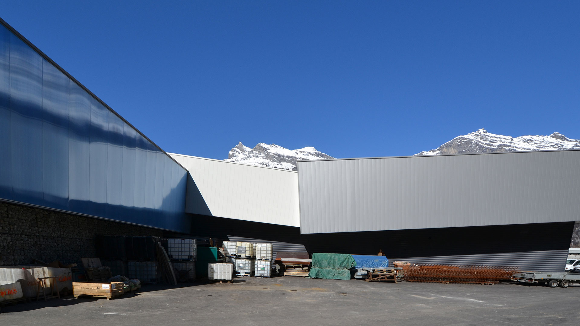 Cette expression est affirmée par la volumétrie du toit avec son porte-à-faux sur l’entrée et ses blocs fragmentés qui rappellent les séracs. Le choix du soubassement en Gabion - pierres disposées dans des cages métalliques-rappelle quand à lui l’activité de l’entreprise : protection contre les chutes de blocs.