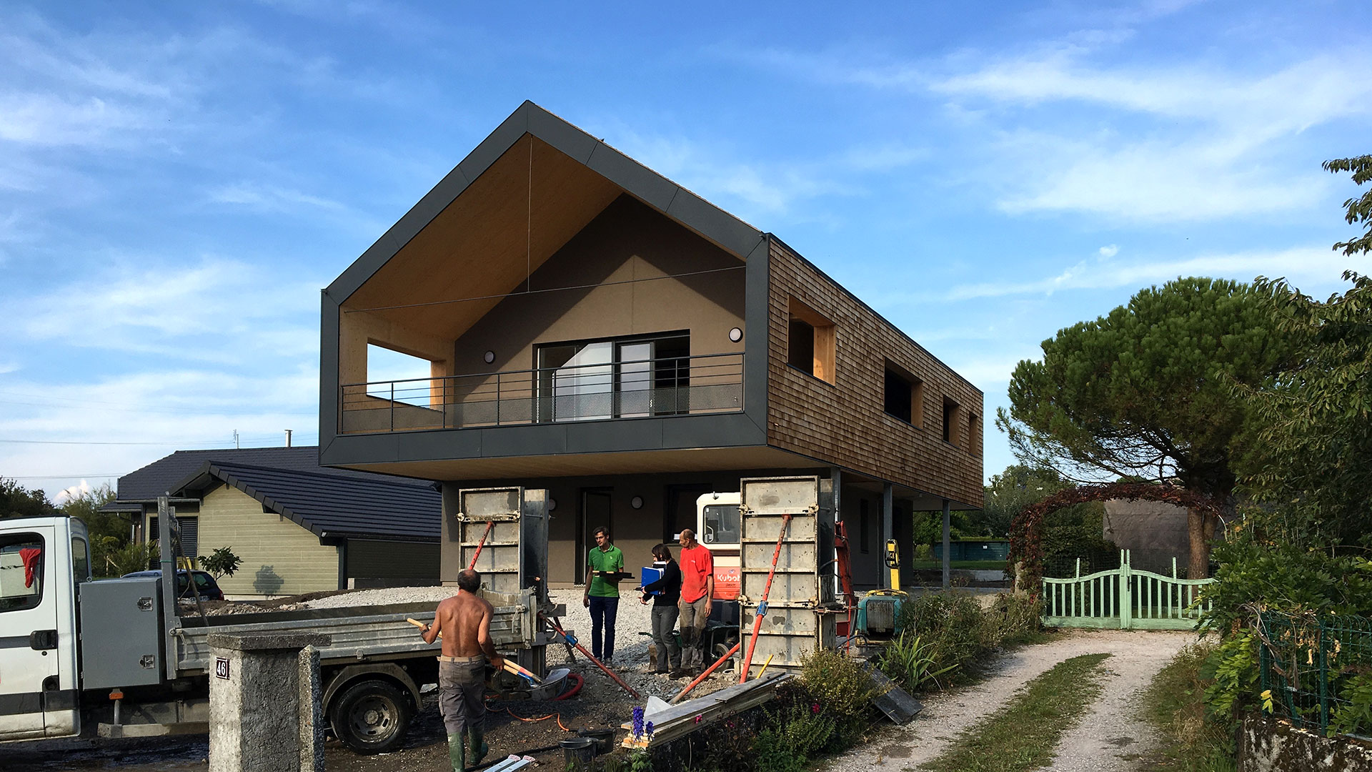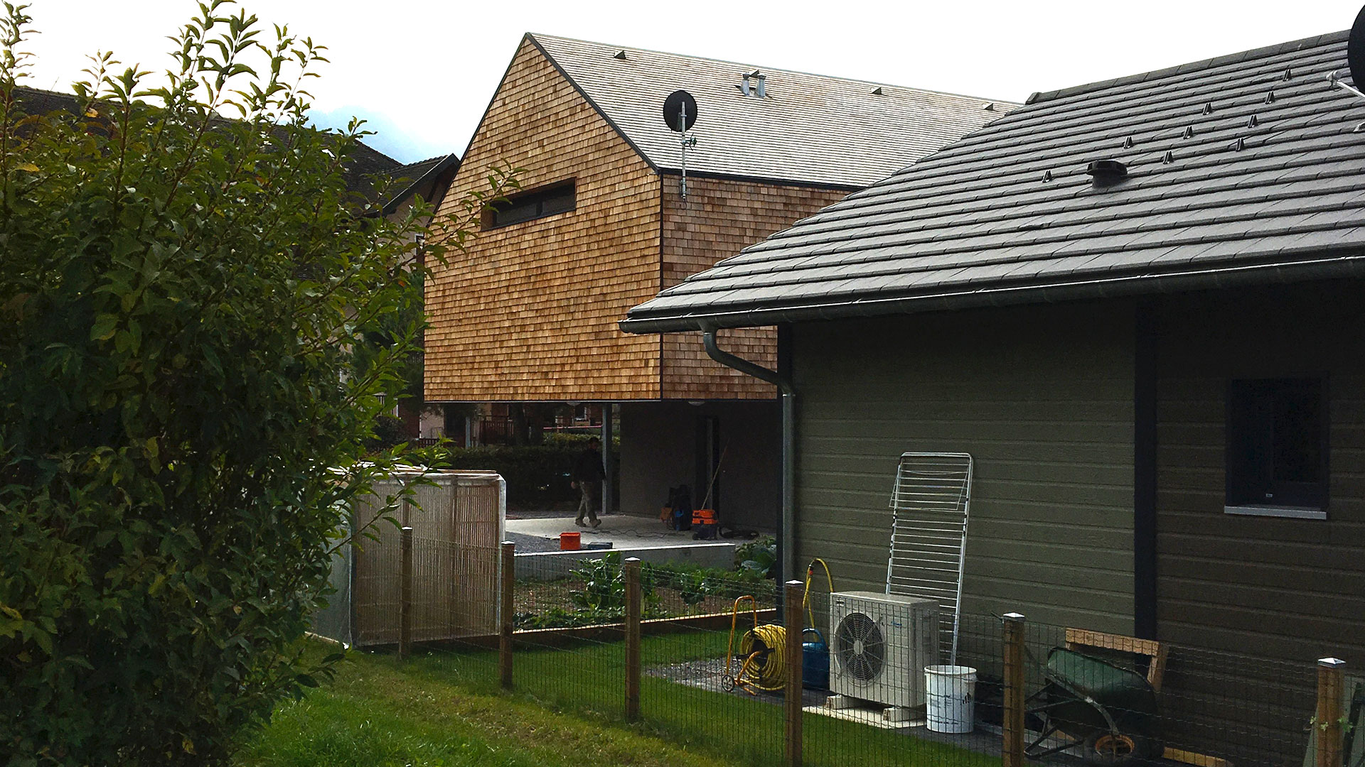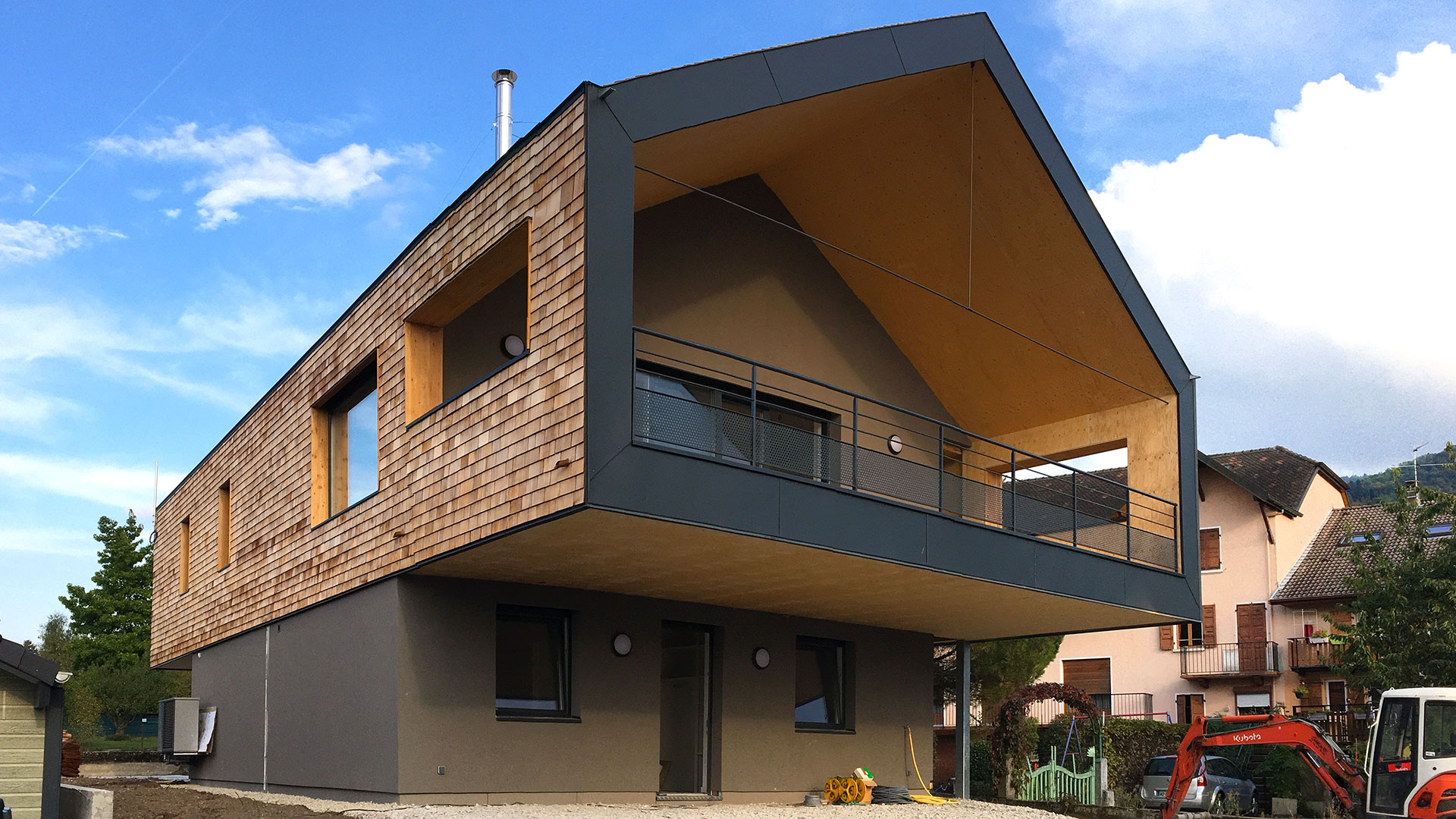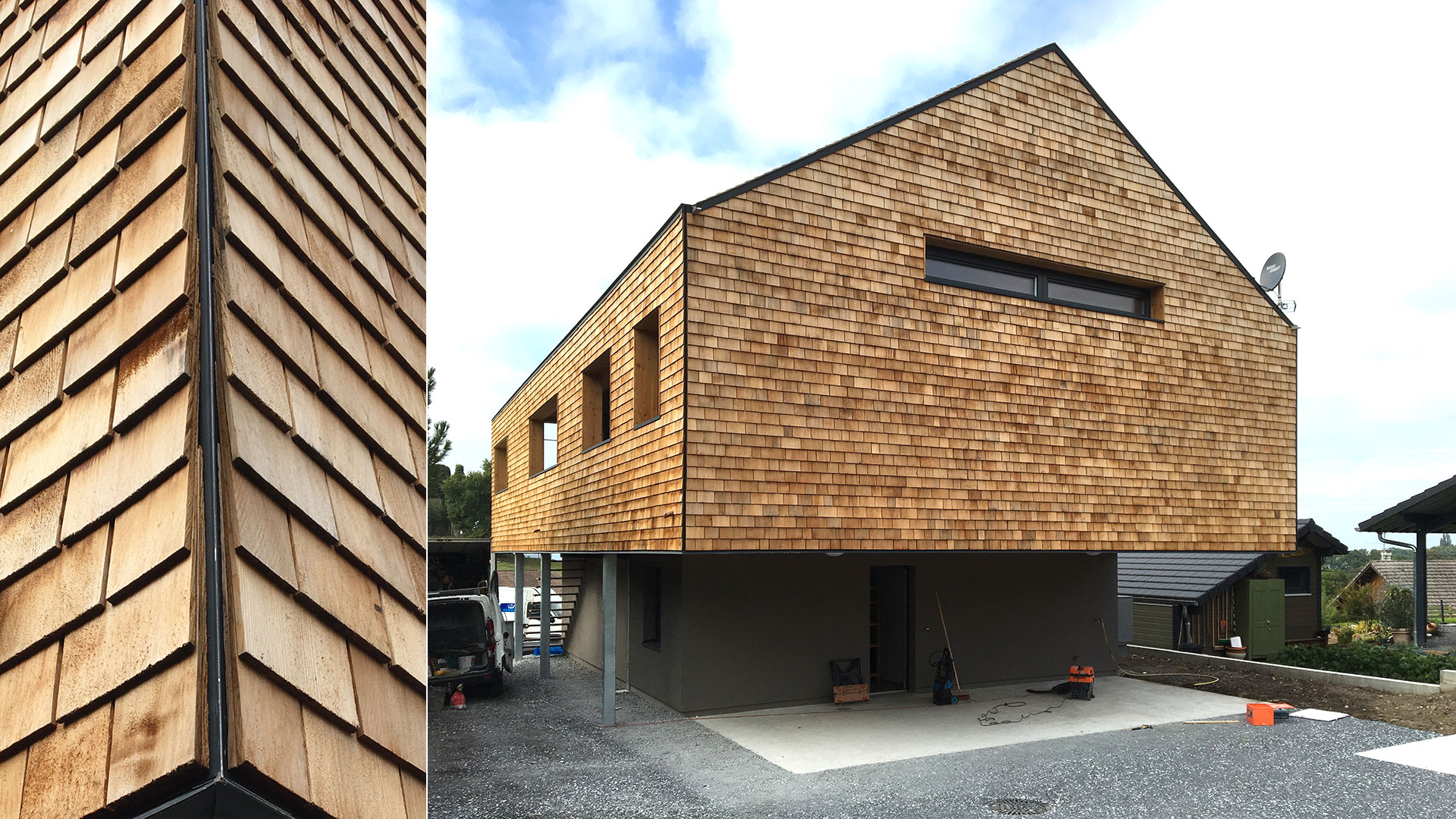 Avec une couverture et un habillage des façades en Tavaillon Red Cedar, des menuiseries en aluminium de teinte gris anthracite, un enduit de teinte grise sur le soubassement et les parties en retrait de l'étage, cette architecture sobre s'intègre dans l'environnement bâti. L'accès à la propriété se fait depuis le chemin des Roncettes. Deux places de stationnement dont une couverte sous un porte-à-faux viennent accueillir les véhicules.
