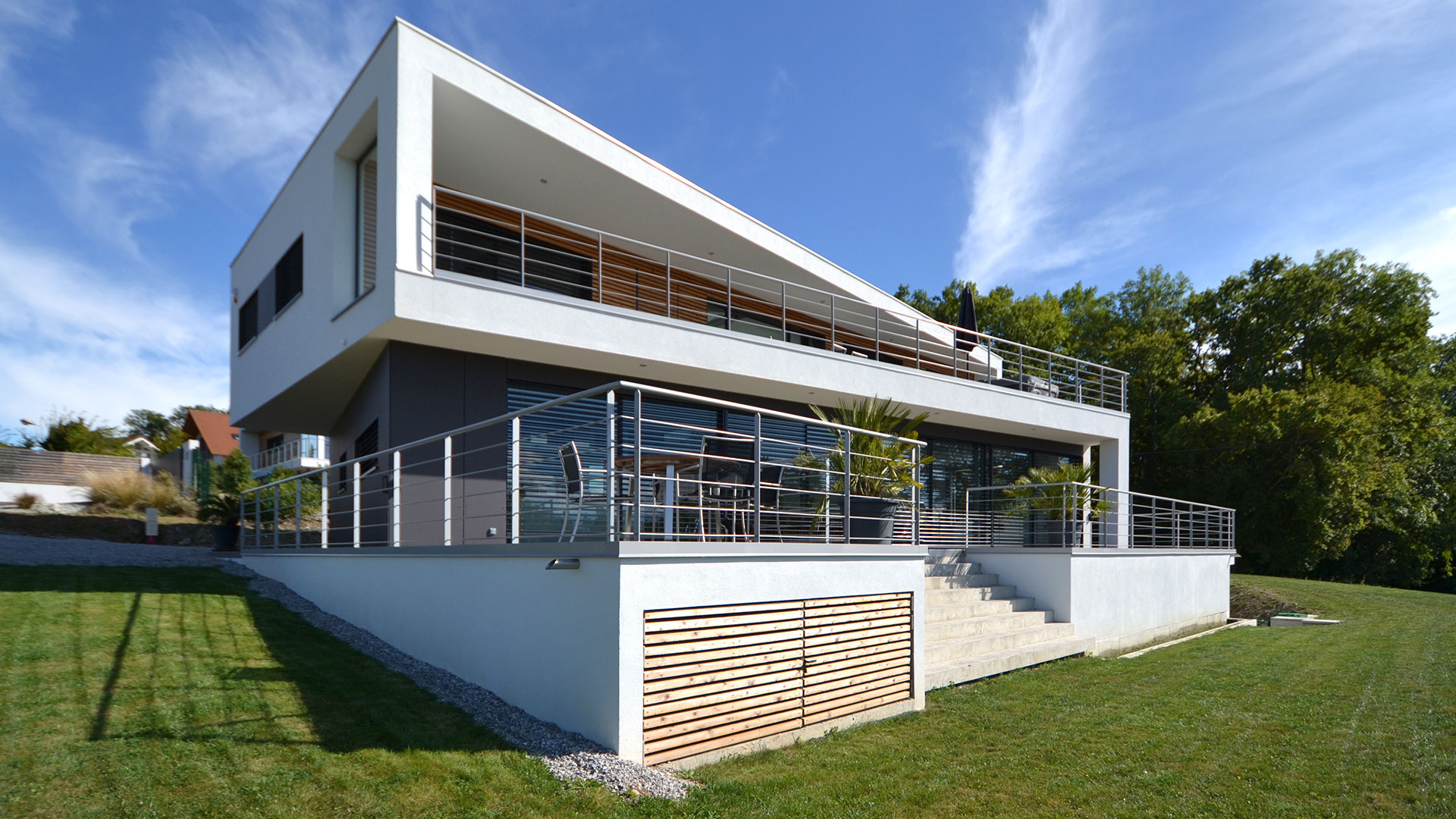 De part son organisation, son implantation et la composition de ses volumes la construction s’intègre harmonieusement aux constructions et paysages avoisinants. Un soin particulier est apporté au traitement des aménagements extérieurs par la plantation de haies vives en limite de terrain. La villa s'élève sur deux niveaux, agençant 4 chambres à l'étage dont une parentale avec terrasse.
